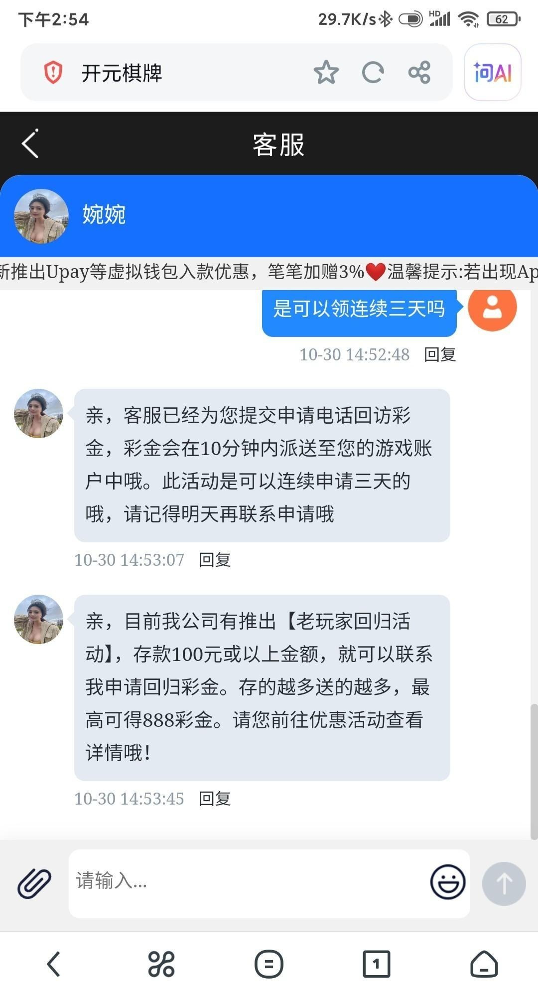 接到电话,开元891老用户回馈,连送三天每天,5我没充过。今天第二天打出来成功出款104链接