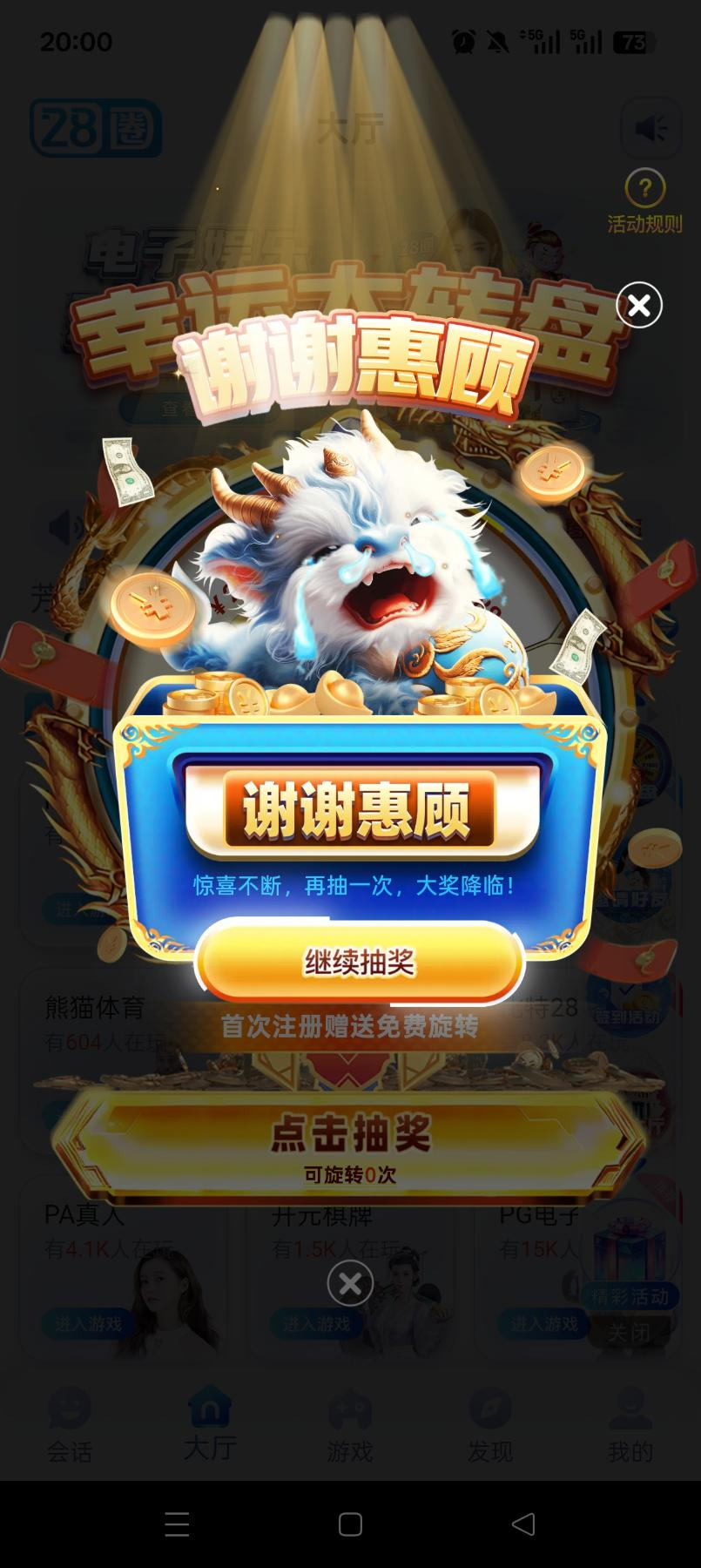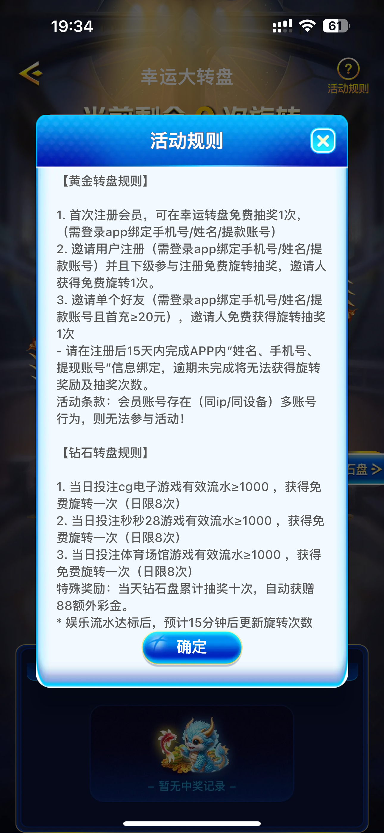 首次注册会员,可在幸运转盘免费抽奖1次,(需登录app绑定手机号/姓名/提款账号)
