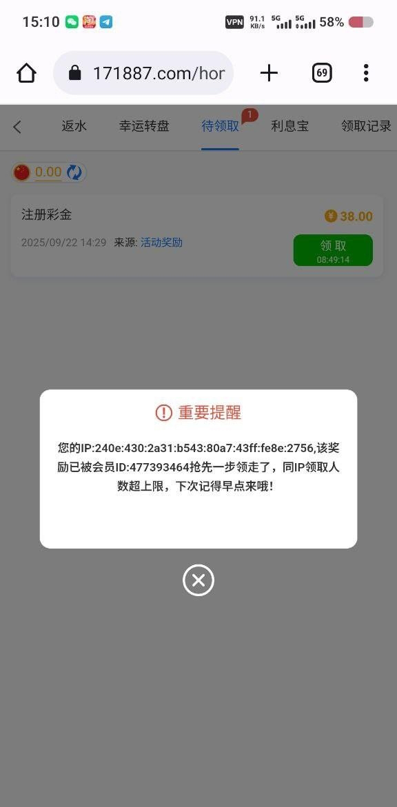 注册绑定手机号银行卡找客服说领取电话彩金如果要通话记录就随便给一个通话截图撸了俩个号第二个号领不了显示IP已领取