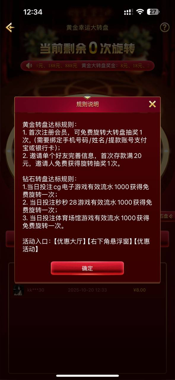 首次注册会员,可在幸运转盘免费抽奖1次,(需登录app绑定手机号/姓名/提款账号)